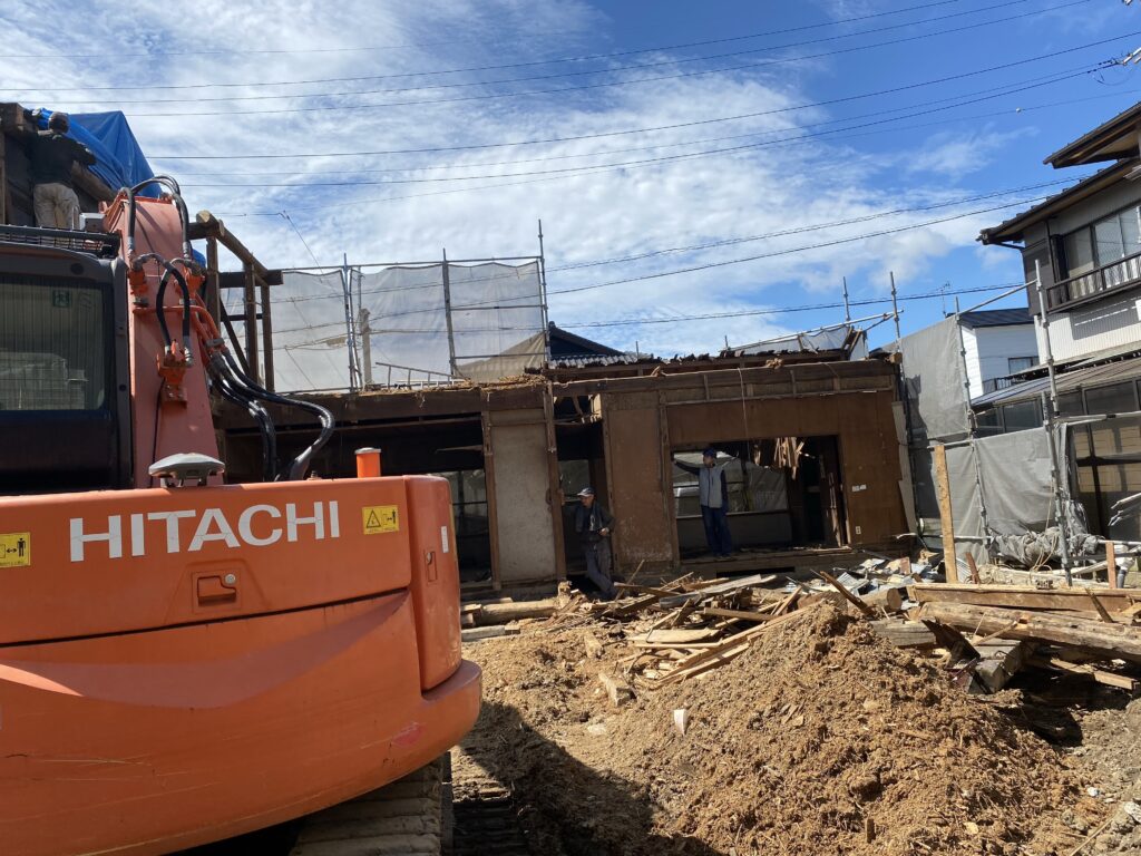 家屋解体用の養生足場盛替作業